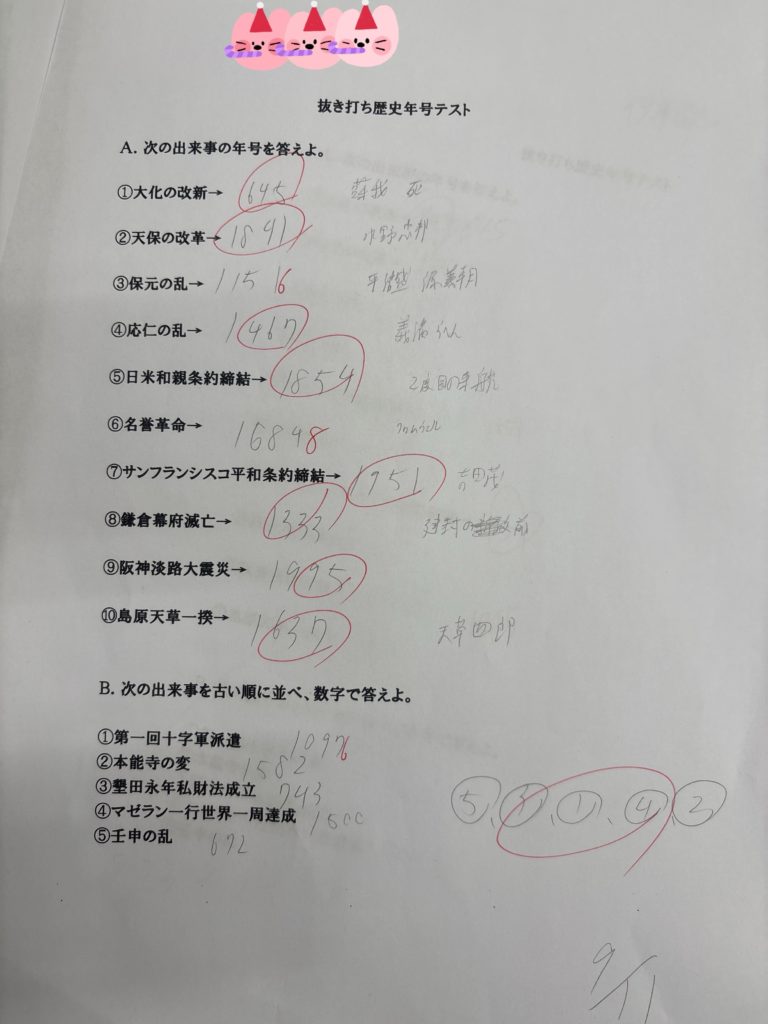 歴史の年号の抜き打ちテストを