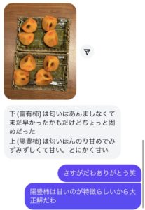 富有柿特有の少しの渋さが本来の甘さを引き出していてとっても美味しい。直売所で売ってるものは少し硬すぎたり、渋すぎたり、、、しかし頂いた柿はバランスがよくてとにかく美味しい